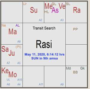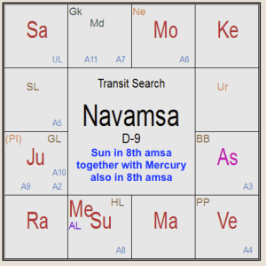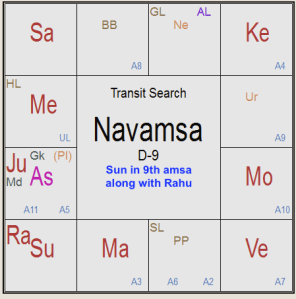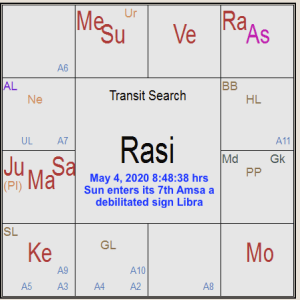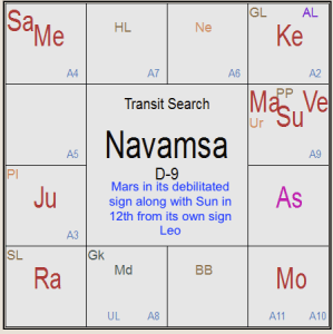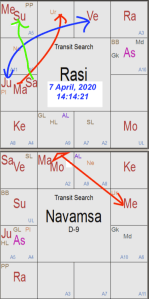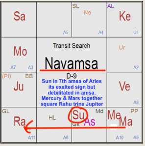 In the chart beside, I have very clearly marked in green in the Rasi chart as to how Saturn aspects Sun and debilitated Mercury (weak) along with Sun (called the Jiva Karaka). Followed by Mars aspecting with the 4th aspect Aries, its own sign in Rasi and in Navamsa, quite unfortunately from its own sign Aries along with Moon the 4th lord of the Zodiac, it aspects debilitated Mercury again with the 4th aspect of transit Mercury in Navamsa too in the 4th sign of the Zodiac. My take is that it is a deadly combination pushing from bad to worse, unfortunately. As far as Jupiter, marked in blue arrow, is concerned, it is aspecting Venus in its own sign and the Ascendant of the Indian Independence chart. I am sorry to say that the situation, which is already gloomy, may become more and more gloomy? Please do not panic, but act just now.